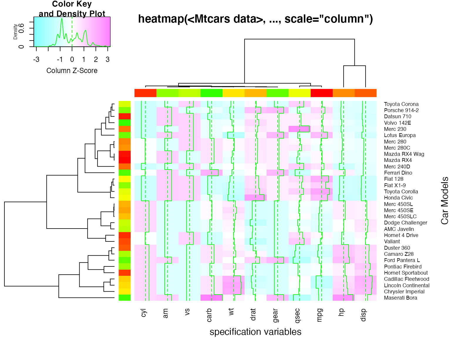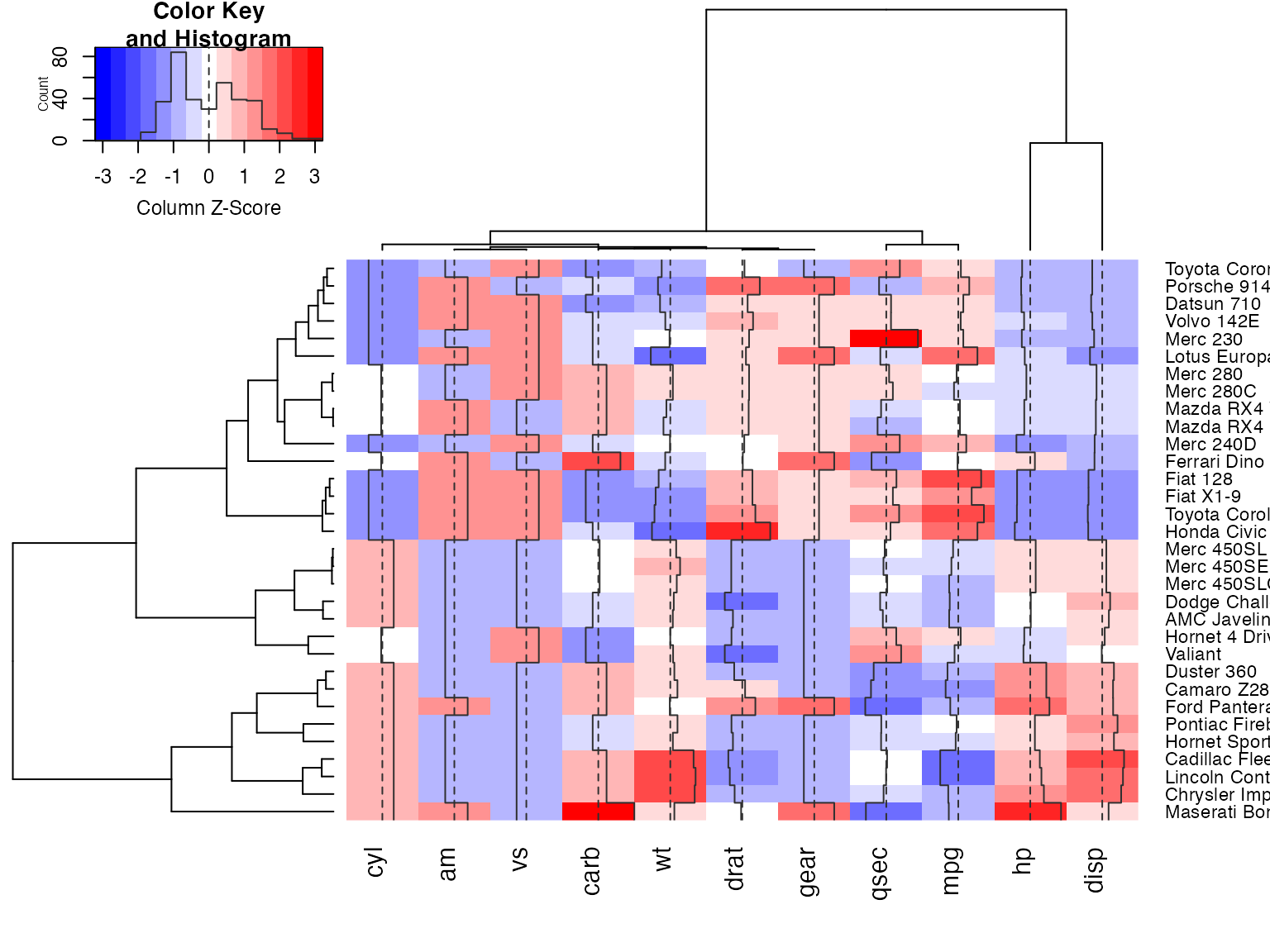 hv <- heatmap.2(x, col=bluered, scale="column", tracecol="#303030")