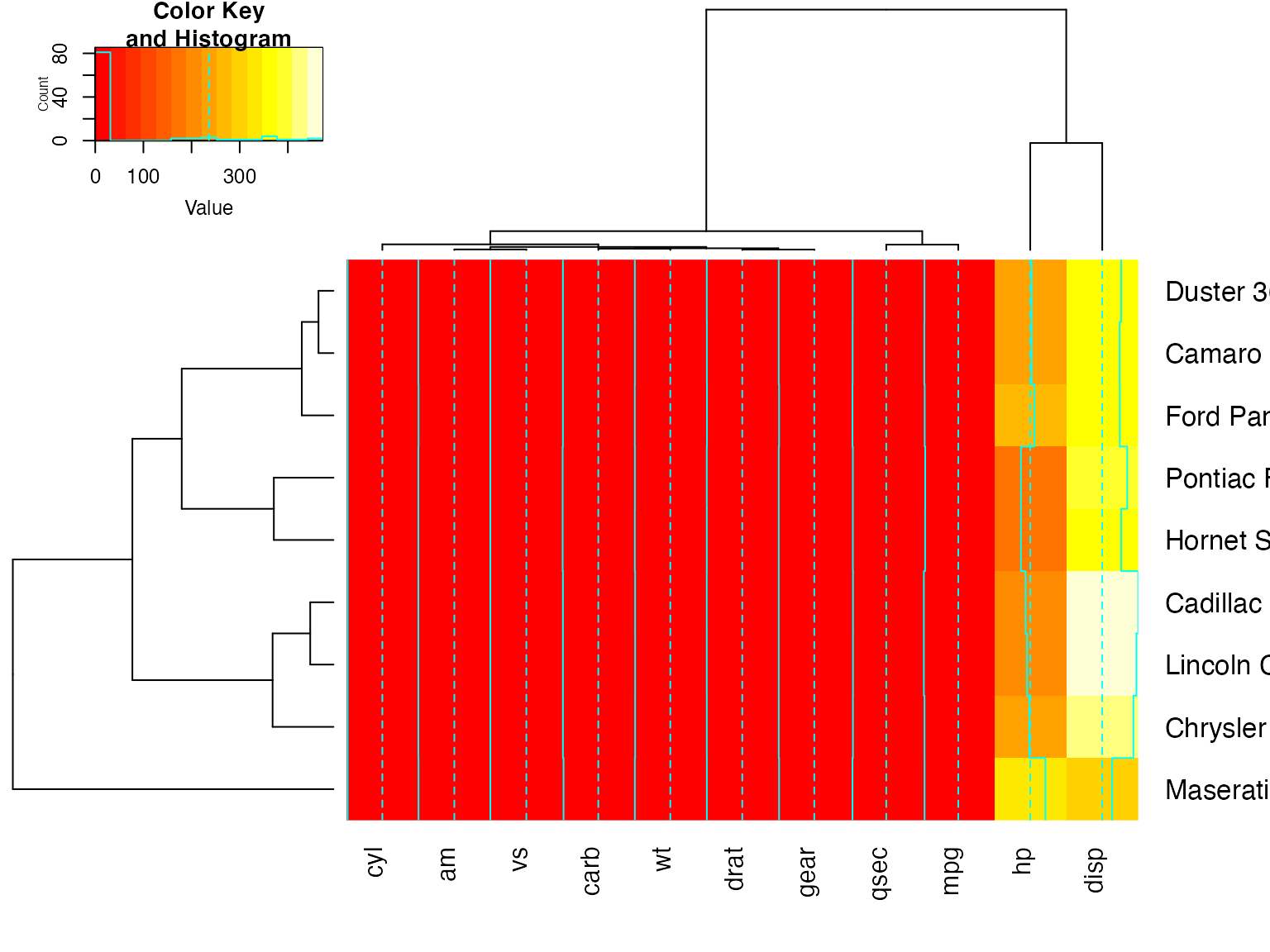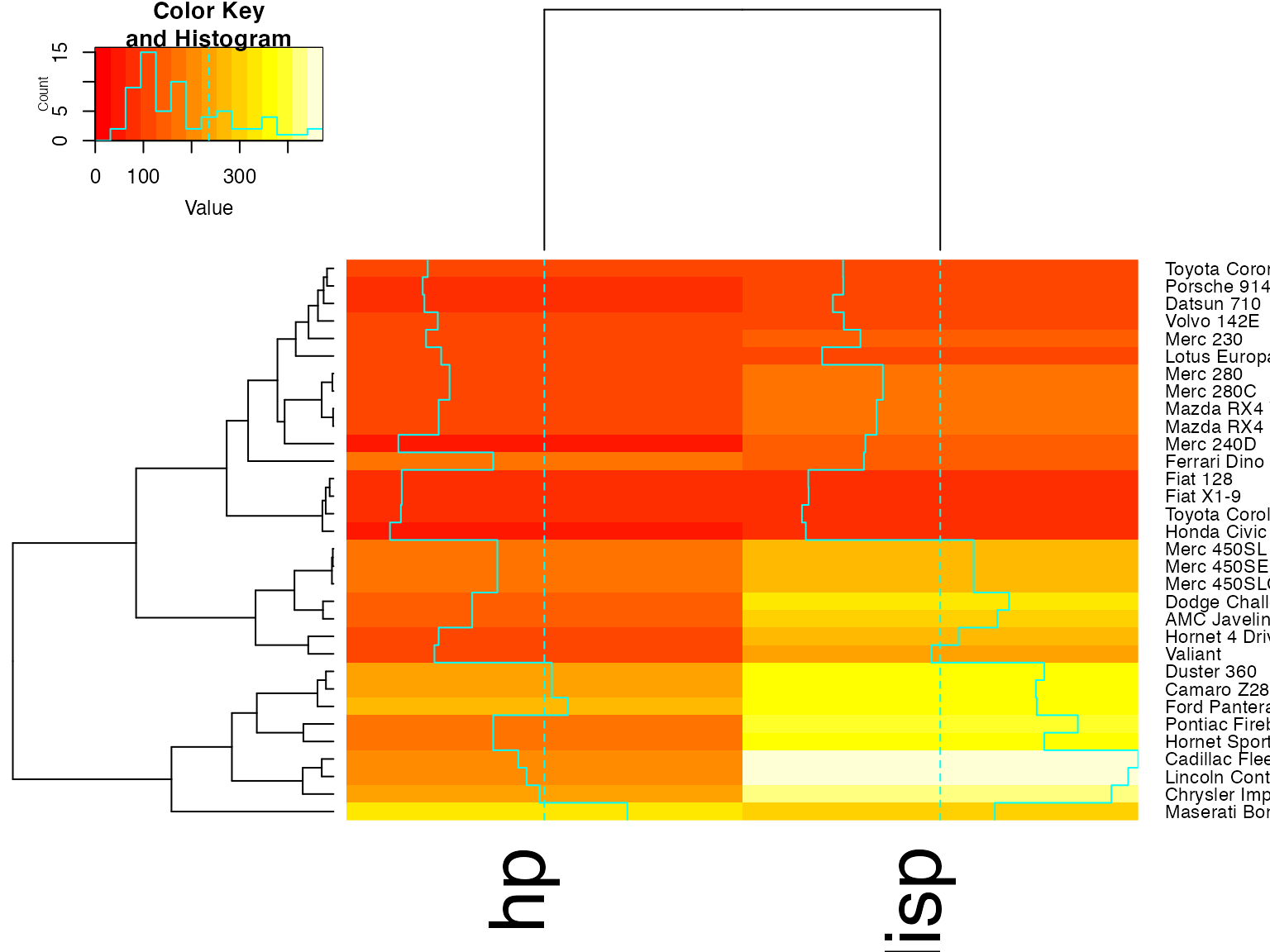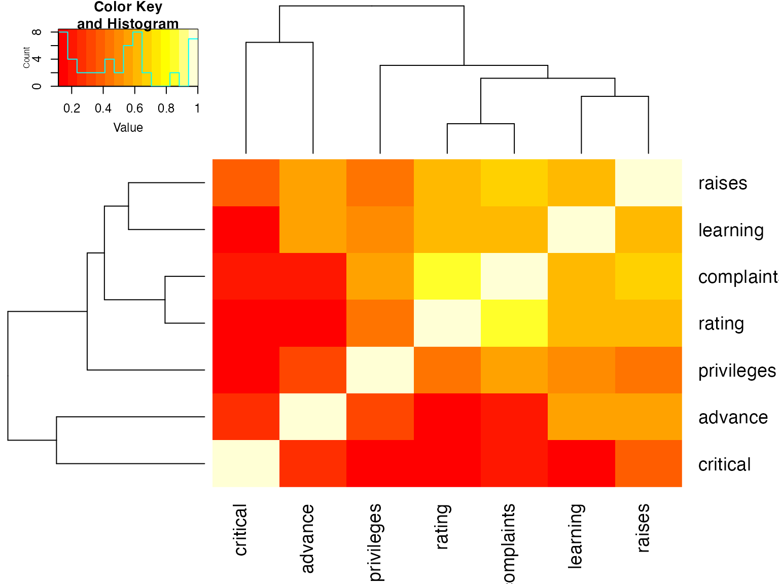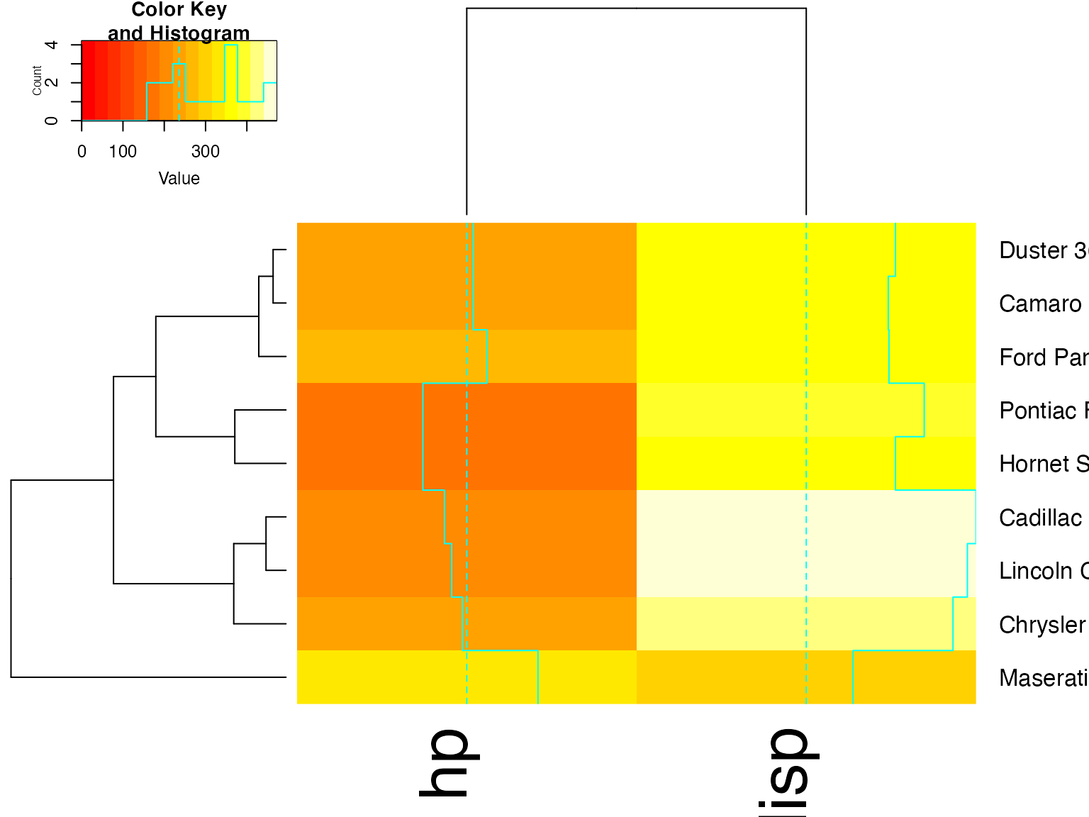 heatmap.2(x, keysize=2) ## default - dendrogram plotted and reordering done.