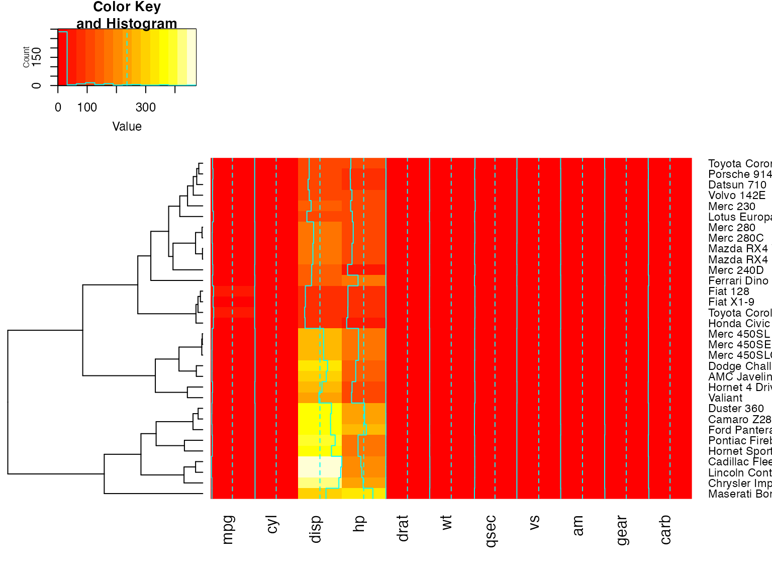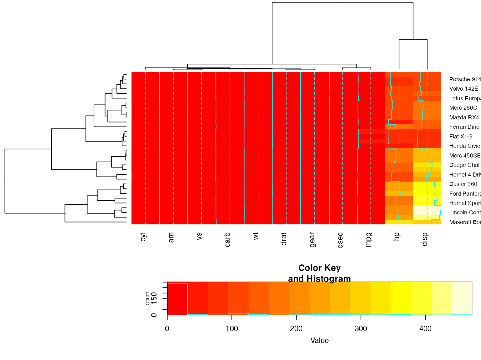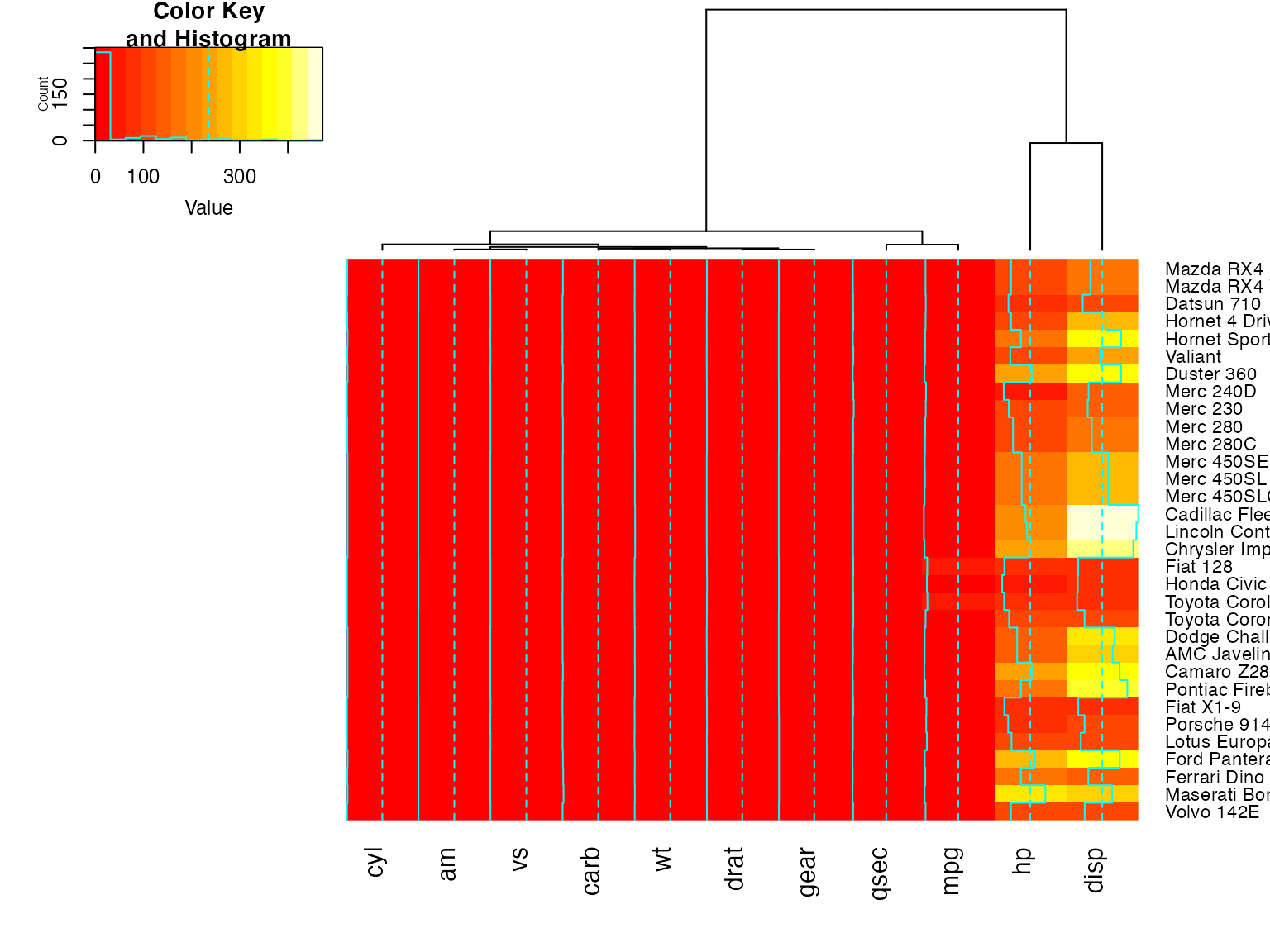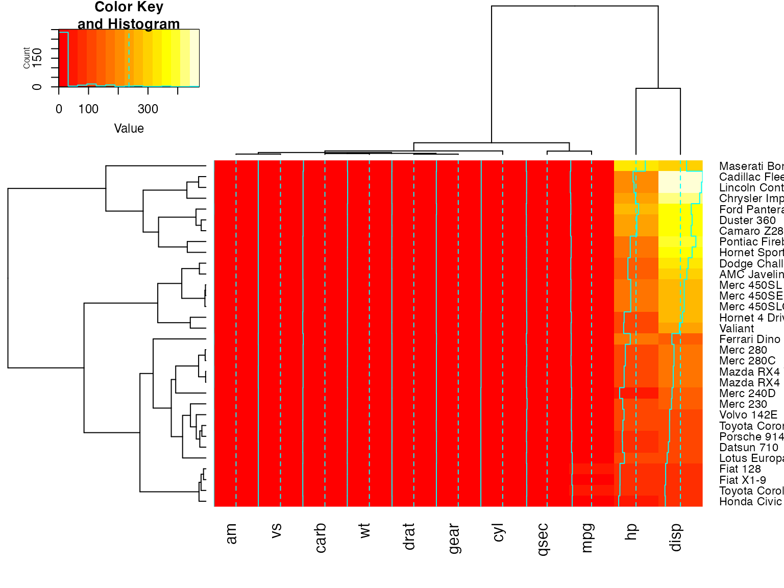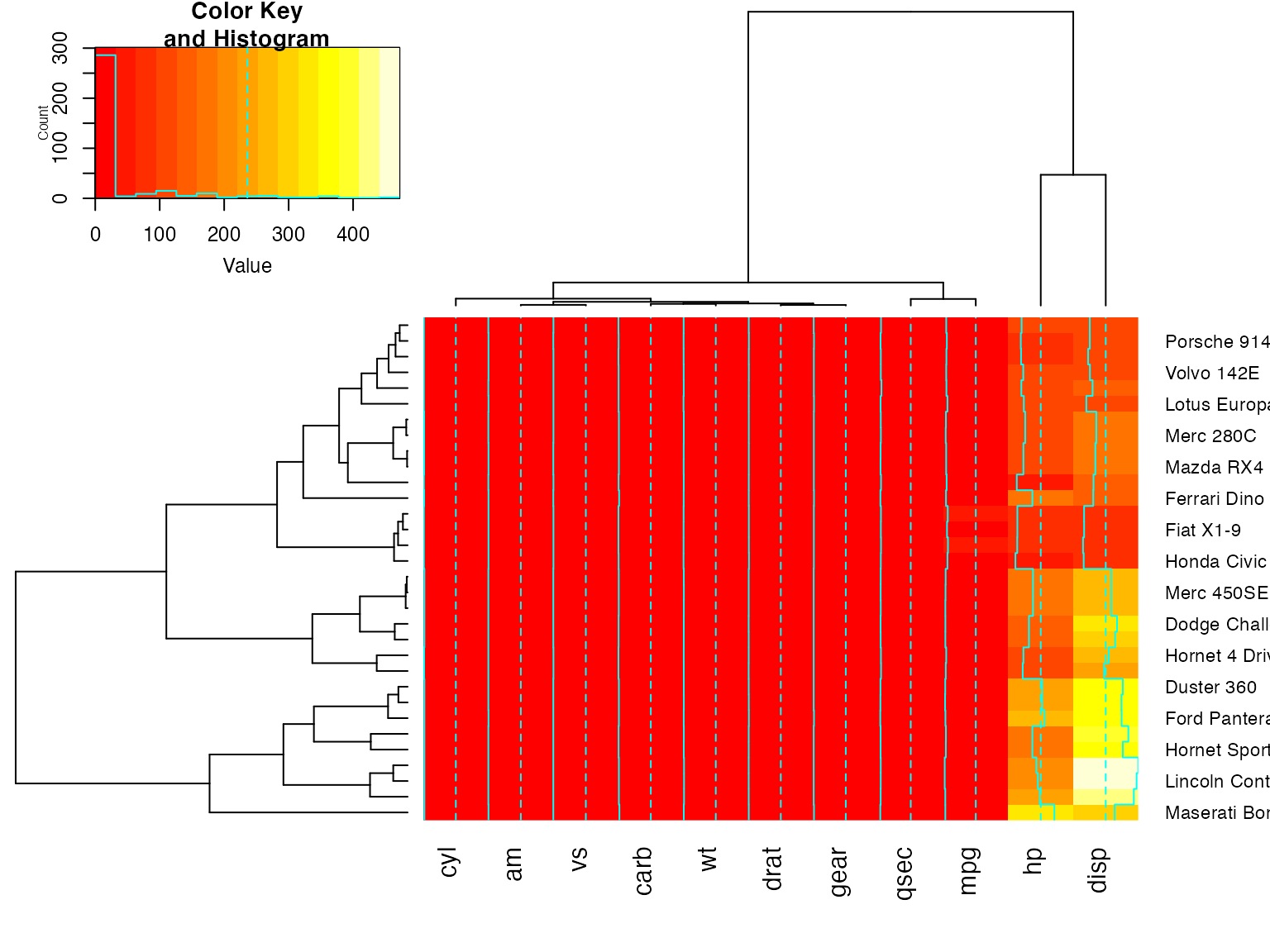 heatmap.2(x, keysize=2) ## default - dendrogram plotted and reordering done.
