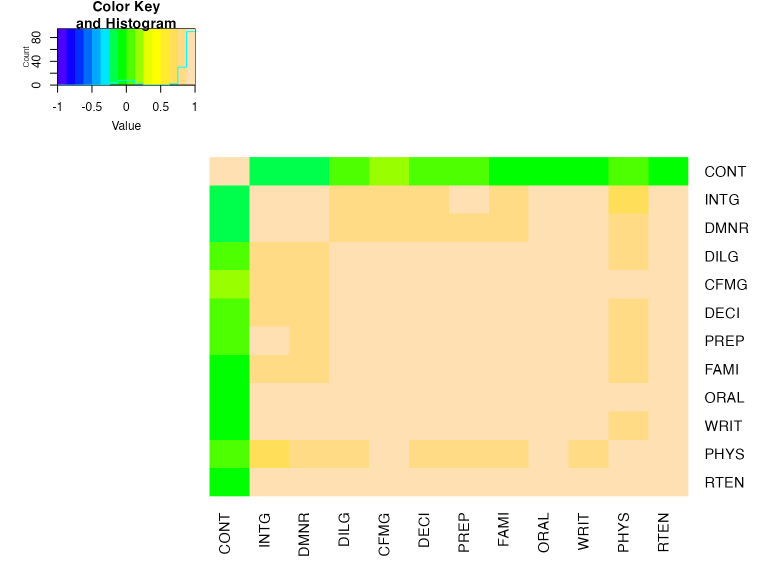 heatmap.2(x, lmat=rbind( c(0, 3, 4), c(2,1,0 ) ), lwid=c(1.5, 4, 2 ) )## CO I DM DI CF DE PR F O W PH R